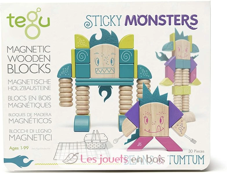 Dieses Set enthält 30 hölzerne Magnetblöcke. Dieses Set aus 30 magnetischen Holzblöcken, die mit kleinen Motiven fein bedruckt sind, gehört zum Sticky Monsters-Sortiment der Marke Tegu.