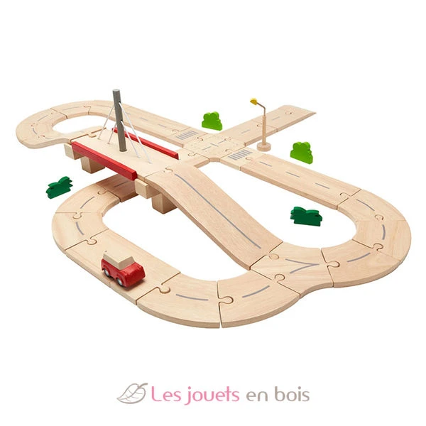 Diese Rennstrecke für Autos umfasst 34 Holzteile: 27 Straßenabschnitte (8 cm breit), 1 Brücke, 1 Auto, 1 Laternenpfahl und 4 Büsche.