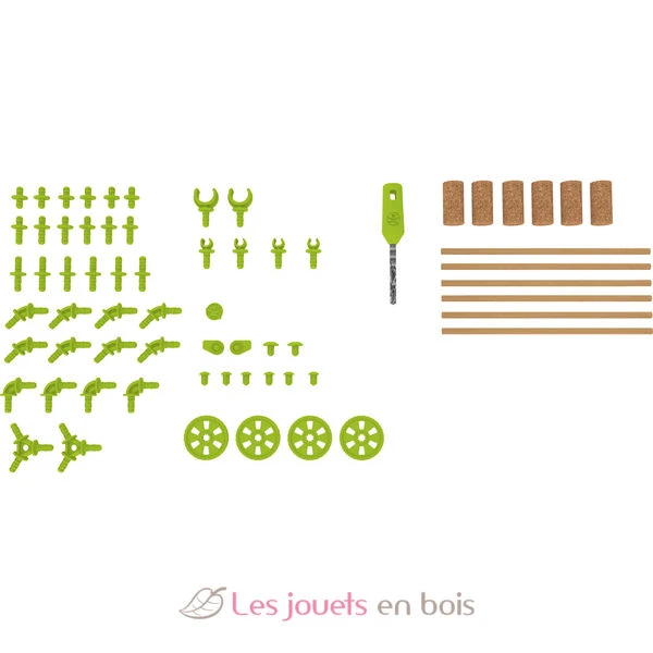 1 Handbohrer (Ø 6 mm), 53 Connectors, 6 Rundstäbe, 6 Korken, Anleitung.