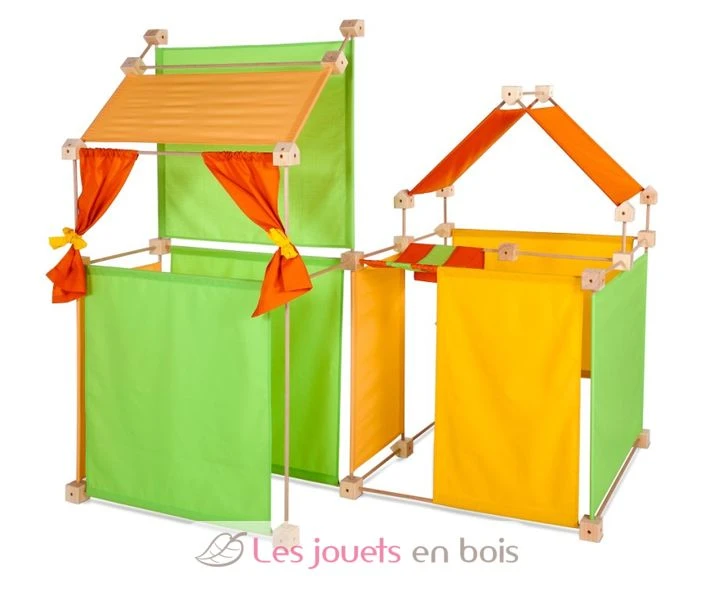 Inhalt : 20 Vierkantklötzchen / 20 Winkelklötzchen / 80 Leisten (4 Längen) / 30 Stoffstücke. Wird in einer Box aus Hartpappe geliefert.