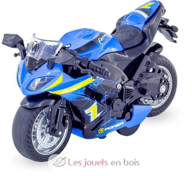 Miniatur-Reibungsmotorrad aus blaufarbenem Metall und Kunststoff.