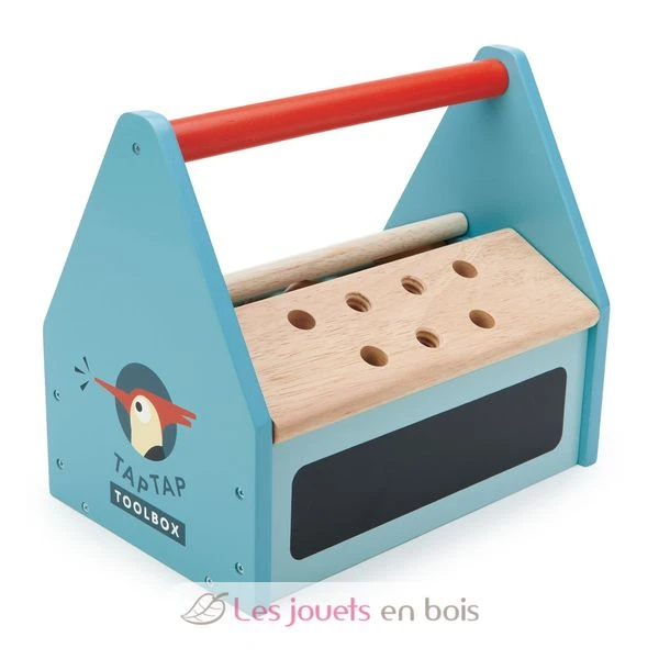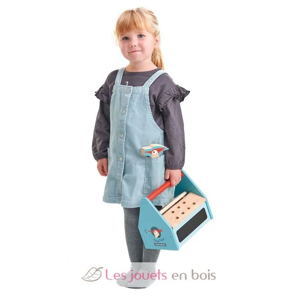 Diese hölzerne Werkzeugkiste für Kinder verfügt über zwei abnehmbare Deckelteile, die sich in anschraubbare Platten verwandeln lassen, und eine bedruckte Stofftasche zum Aufbewahren von Werkzeugen nach dem Spielen.
