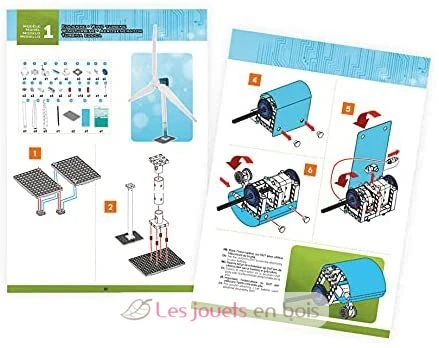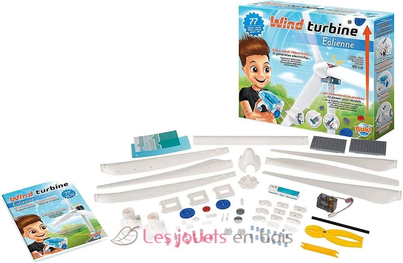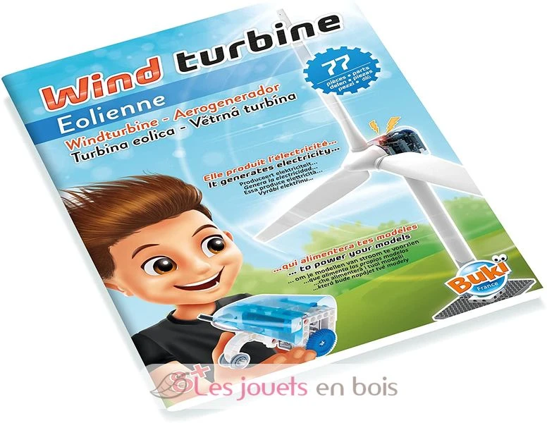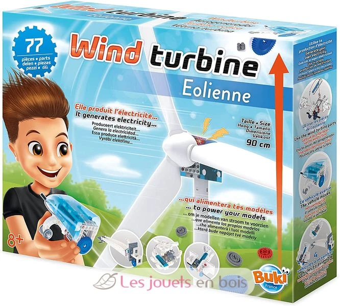 Der Wind dreht die Blätter und der Generator erzeugt Strom zum Aufladen einer Batterie (R6 AA-Akku nicht im Lieferumfang enthalten). Der erzeugte Strom kann auch den Motor eines zu montierenden Fahrzeugs antreiben.