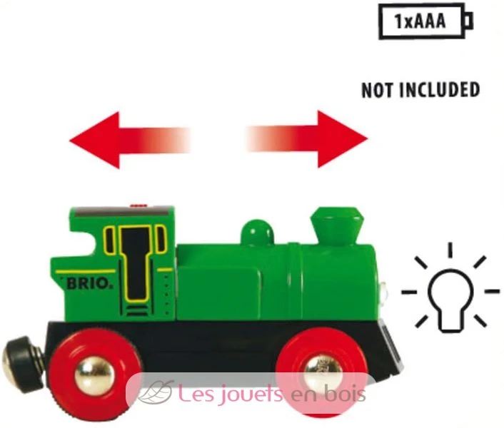 Ziemlich Lokomotive 9 cm Zelle grün. Diese Lok Brio Fuß vorwärts / rückwärts und hat einen Scheinwerfer. Dieses Spielzeug funktioniert mit einer Batterie (nicht enthalten).